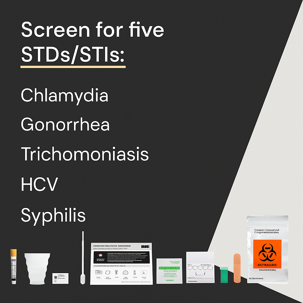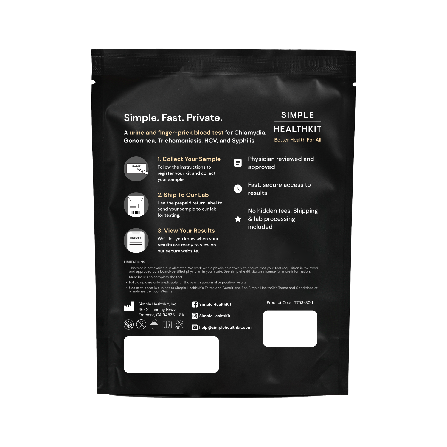 - Tests for 5 STDs: An easy-to-use 5-Panel STD test with simple, fast, and private results. Simple HealthKit's 5-Panel STD Test screens for 5 STDs / STIs: Chlamydia, Gonorrhea, Trichomoniasis, HCV, Syphilis.